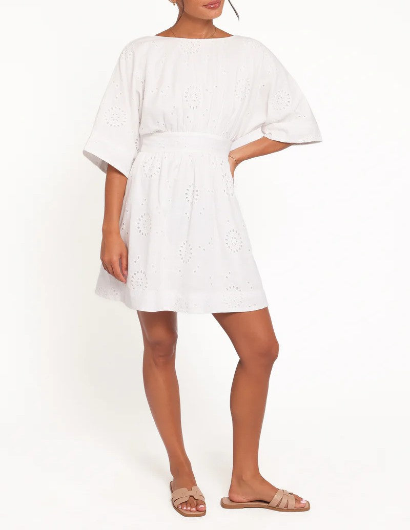 Make a memorable entrance in the Open Back Mini Dress. This white mini features a sophisticated boat neckline and charming mid-length flare sleeves, creating a beautifully balanced silhouette.